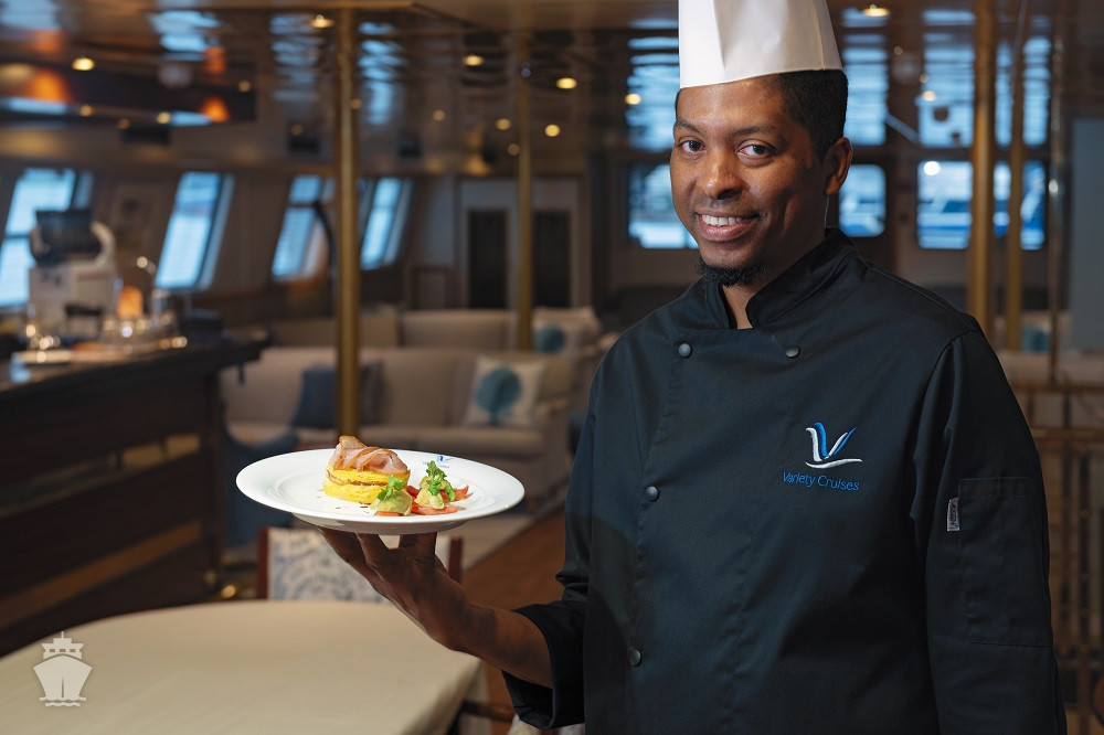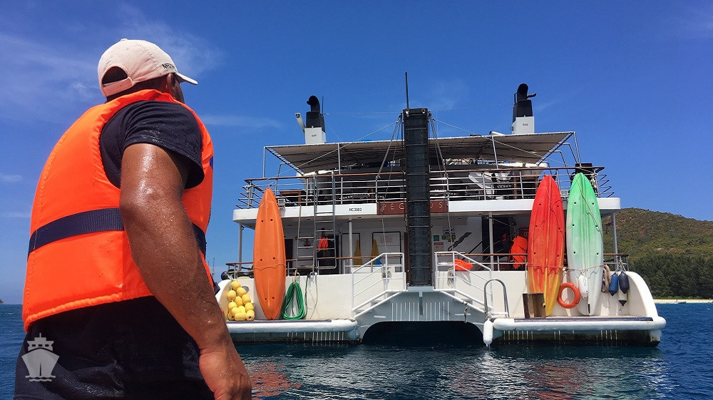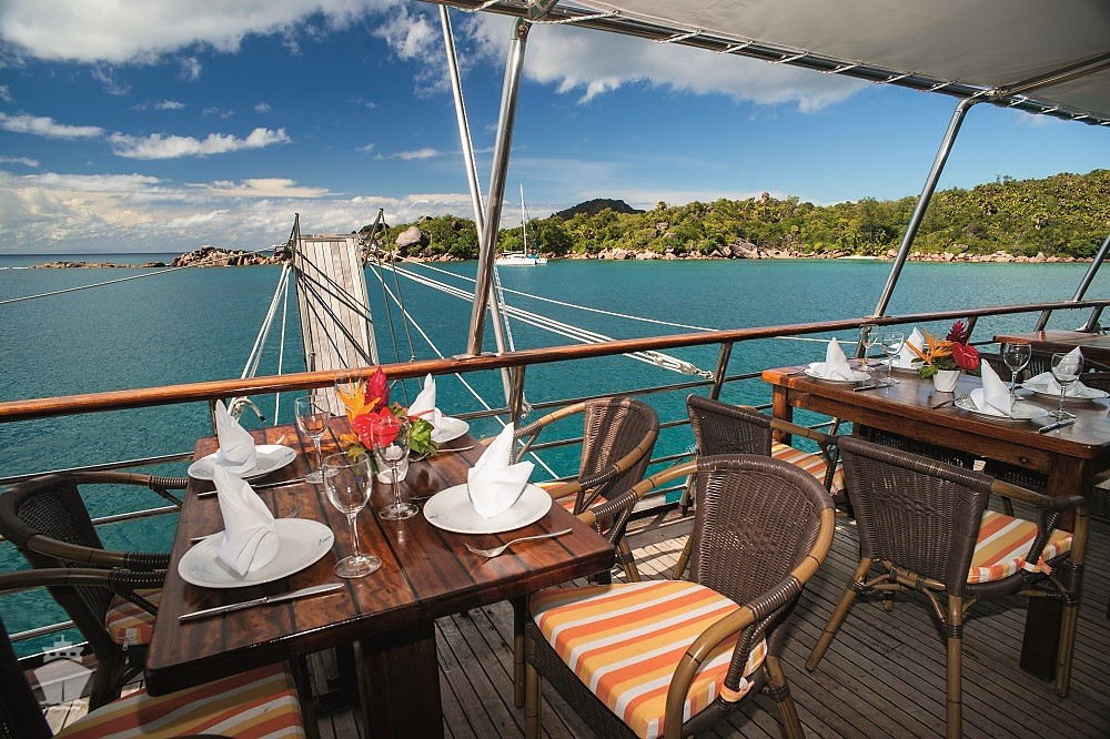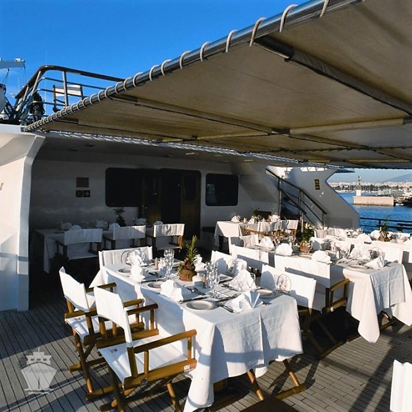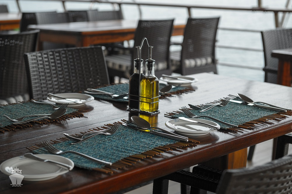 Na vonkajšej palube je taktiež tienená jedálenská časť s výhľadom na more, kde sa odohrávajú obedy formou bohatého bufetu. V priemere dvakrát do týždňa sa koná barbecue priamo na palube alebo na brehu.