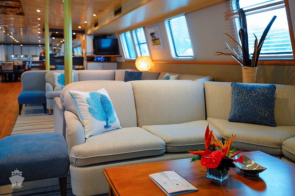 Na hlavnej palube sa nachádza komfortný salón, vybavený pohodlnými kreslami a elegantný bar. Vedľa salónu nájdete knižnicu s výberom kníh v rôznych jazykoch a k dispozícii sú aj rôzne spoločenské hry.