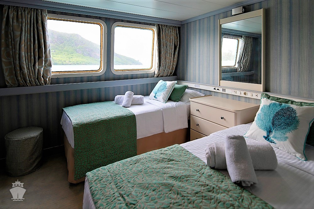 Vybavenie kajút: kúpeľňa so sprchou, regulovateľná klimatizácia, kanál s reprodukovanou hudbou, Tv, telefón pre vnútorné použitie, bezpečnostná schránka, mini bar, sušič na vlasy.