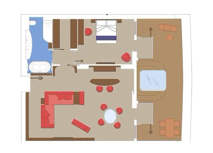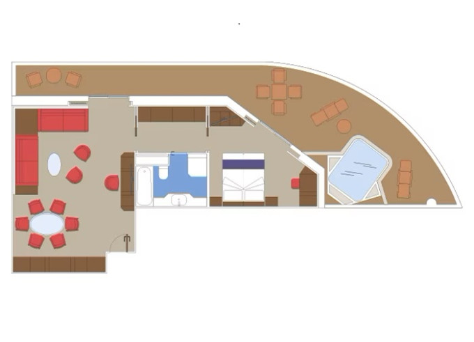 YC3 - Yacht Club Royal Suite s vírivou vaňou 51-59 m² / balkón s vírivkou 42-51 m². Oddelená obývačka a spálňa, šatník, kúpeľňa s vaňou. Max 4 osoby. 16/18. paluba. Cenový model MSC Yacht Club. | 10 750 € 10 750 € za osobu |