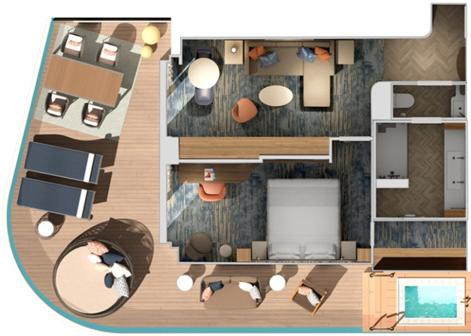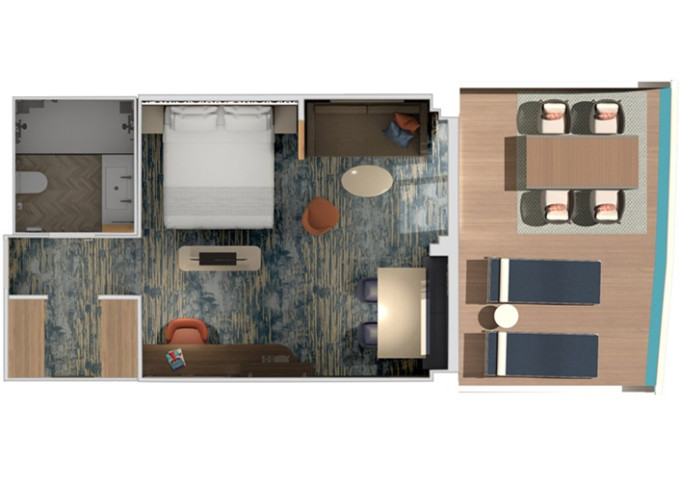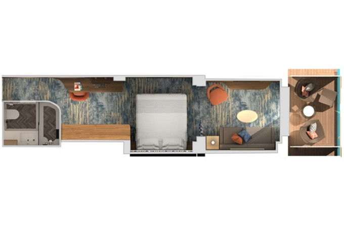 HS - Suite Havana Cabana 28 m² + vonkajšie patio 8 m². 8. paluba vpredu. Tropický štýl, vstup do exkluzívnej zóny Havana. Výhody Suite. Táto kajuta je určená pre hostá od 12 rokov. | 2 288 € 1 144 € za osobu |