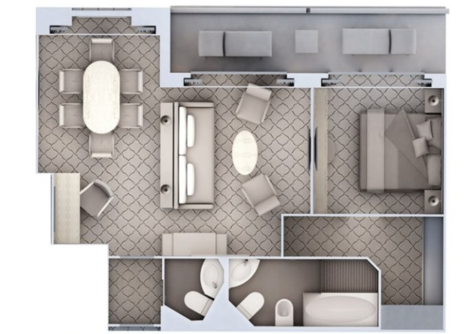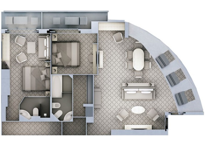 | R2 - Royal Suite 2 96 m² (vrátane 2 balkónov 16,5 m² spolu). 6. paluba. Max 6 osôb. | 116 800 € 116 800 € za osobu |