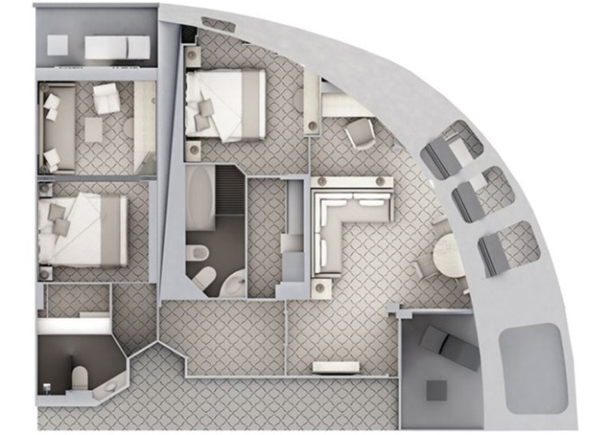 | R2 - Royal Suite 2 96 m² (vrátane 2 balkónov 16,5 m² spolu). 6. paluba. Max 6 osôb. | 175 200 € 58 400 € za osobu |