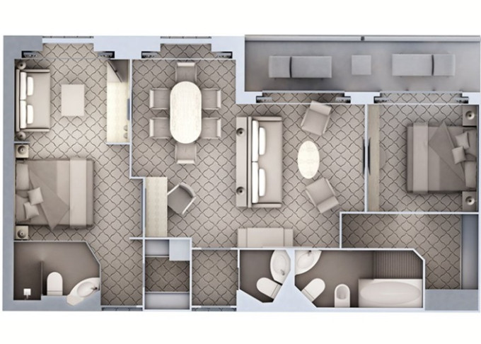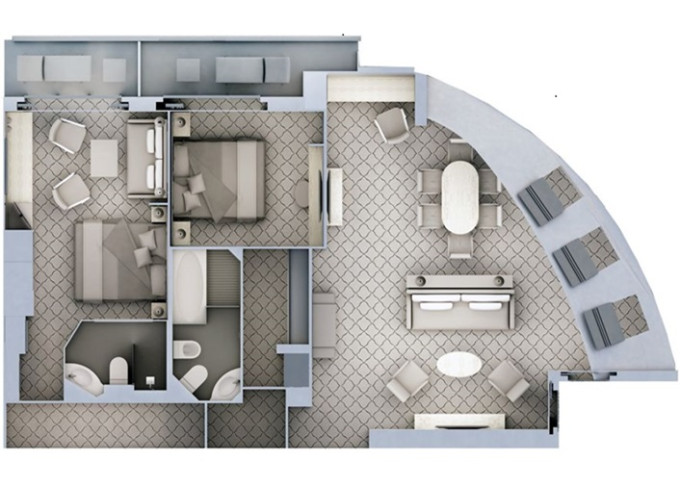 R2 - Royal Suite 2 79,5 m² + balkóny 16,5 m. Royal Suite R1 spojená s Veranda Suite. 6. paluba - vpredu. Max 5 osôb. 119 400 € 59 700 € za osobu