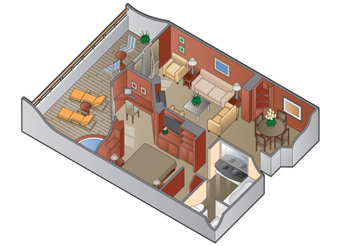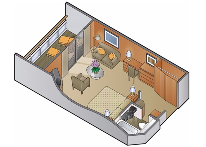 CS - Celebrity Suite 43 m² + balkón 8 m². Vírivka. 6. až 9. paluba. Max 3 osoby. Výhody Suite. Vstupná hala, spálňa s TV, šatník, kúpeľňa s vaňou a sprchou, obývačka, media center, 52-inch TV so surround sound. 12 320 € 6 160 € za osobu