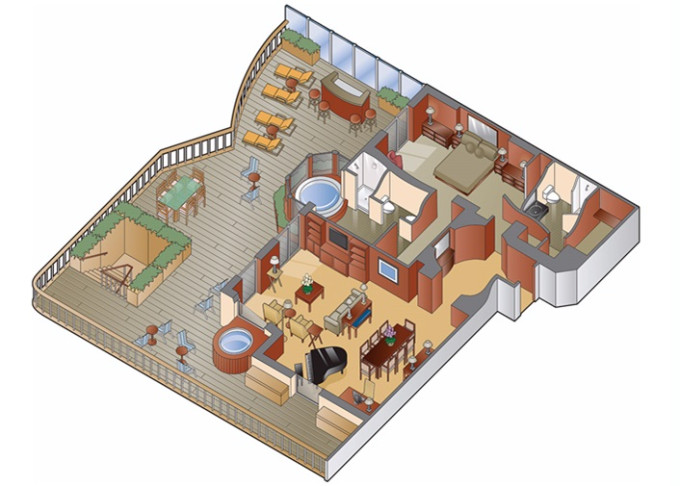 RS - Royal Suite 50 m² + balkón s vírivkou 18 m². Kúpeľňa s vírivkou. 6. paluba vzadu. Max 3 osoby. Výhody Suite. 19 617 € 6 539 € za osobu
