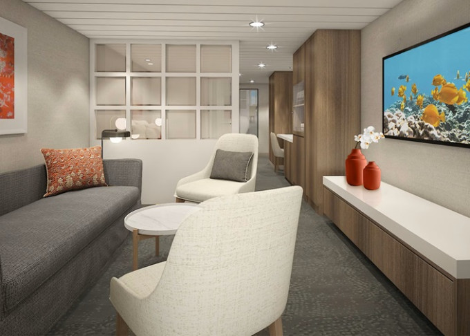 CS - Celebrity Suite 43 m² + balkón 8 m². Vírivka. 6. až 9. paluba. Max 3 osoby. Výhody Suite. Vstupná hala, spálňa s TV, šatník, kúpeľňa s vaňou a sprchou, obývačka, media center, 52-inch TV so surround sound. 19 560 € 4 890 € za osobu
