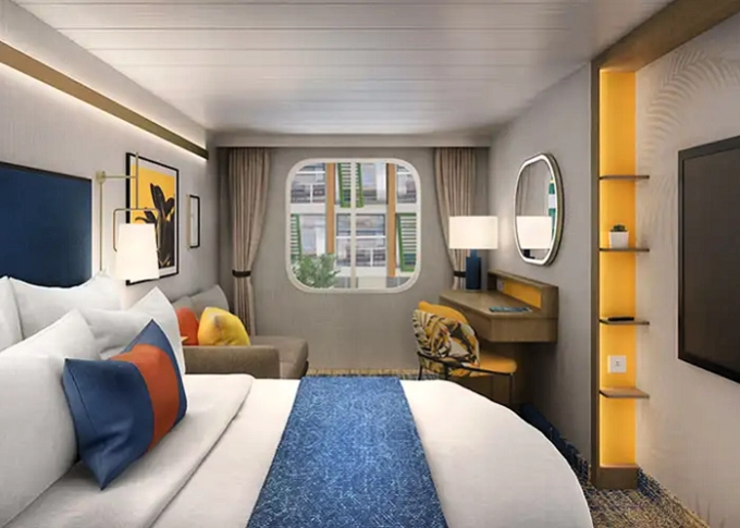T5 - Vnútorná kajuta s oknom / Surfside Family 17 m². Neotvárateľné okno s výhľadom na štvrť Surfside. 8. paluba vpredu. Max 4 osoby. 3 052 € 1 526 € za osobu