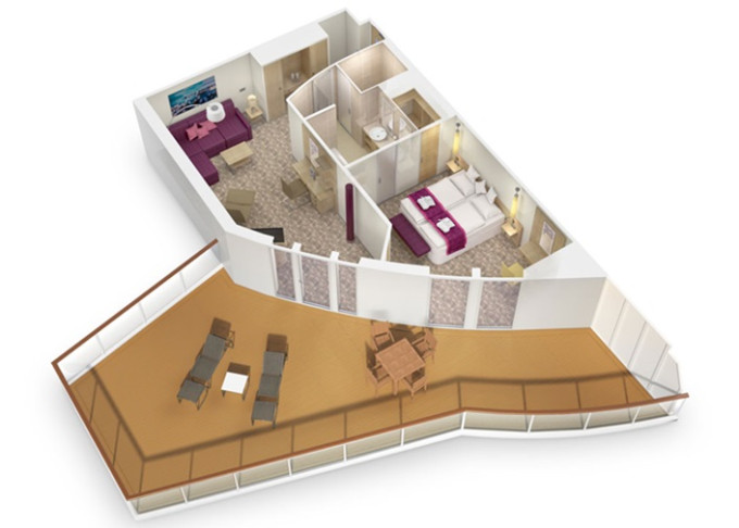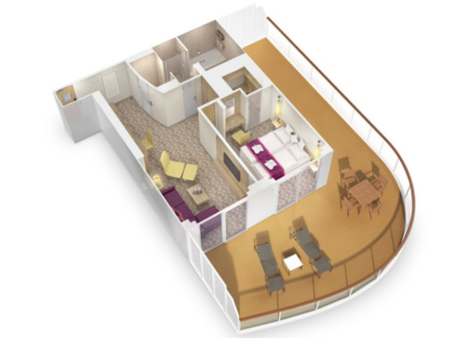SA - Penthouse Suite PREMIUM 53 m² + súkromná terasa 20 m². 2-podlažný apartmán. 12,14. paluba. Max 4 osoby. Cenový model Premium + výhody Suite. | 6 740 € 3 370 € za osobu |