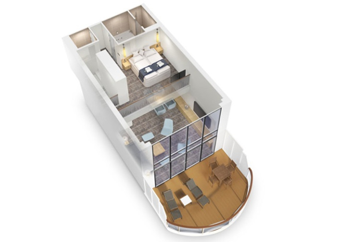 DL - Kajuta s verandou Deluxe Lounge PREMIUM 17,5 m² + balkón 11 m². 9. paluba. Max 5 osôb. Cenový model Premium. | 2 490 € 1 245 € za osobu |