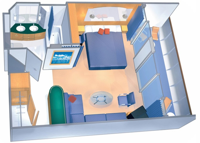 | 1K - Veľká vonkajšia kajuta Ultra Spacious 56 m². Neotvárateľné okno. Oddelená časť s poschodovou posteľou. Max 6-8 osôb. | 1 764 € 588 € za osobu |