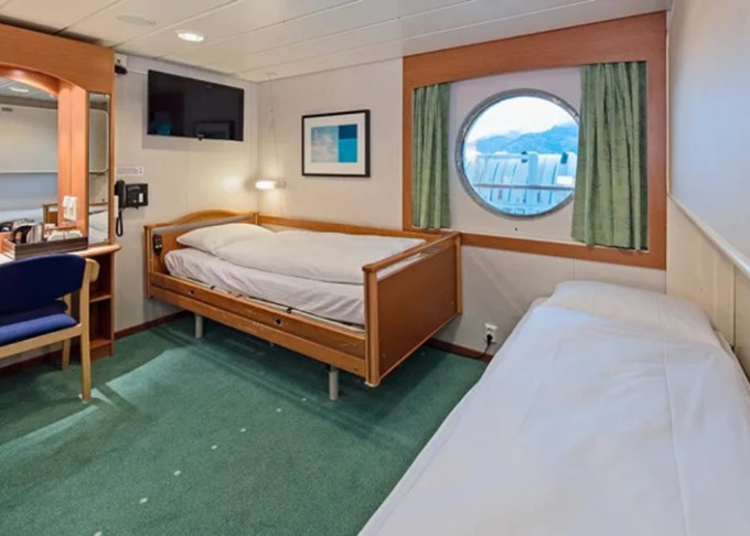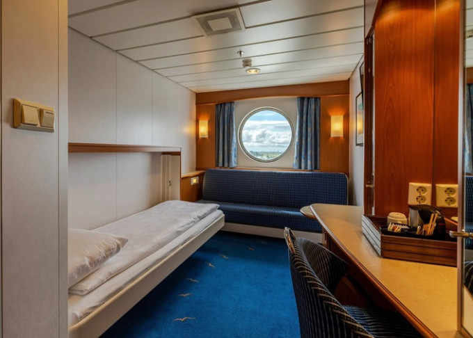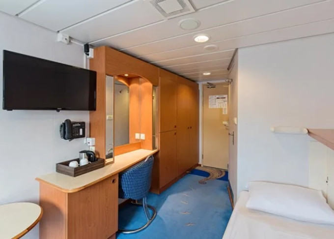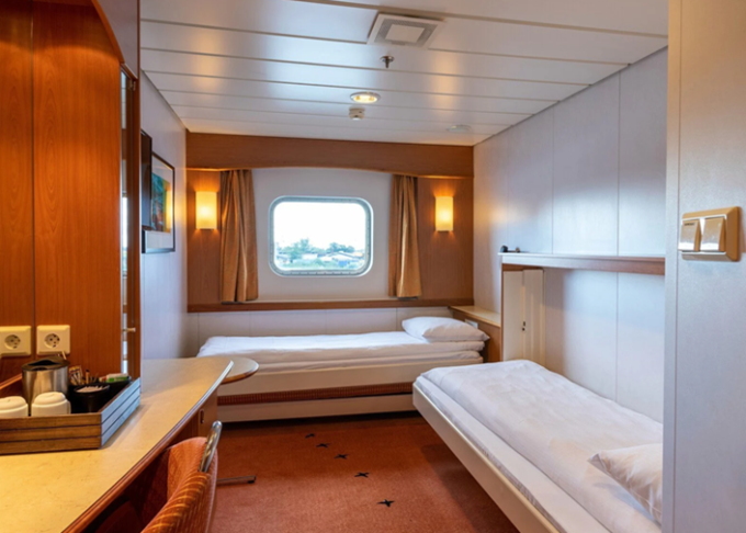 Kajuty na 7. a 8. palube, s 2 lôžkami spojiteľnými do manželskej postele; varnou kanvicou a TV.