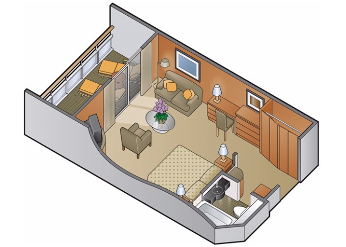 - Kajuty sú umiestnené v blízkosti lodného Spa. K ich vybaveniu patrí posilnený systém vzdušnej filtrácie, posteľ Queen-Size (v kategóriách Edge King-Size), veľké zasúvacie sklenené dvere, exkluzívne posteľné prádlo eXhale®, veľkorysé skladovacie priestory.