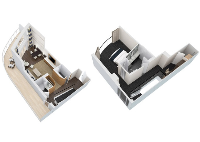 SL - Sky Loft Suite s balkónom 62 m² + balkón 17 m². 2-podlažný apartmán. Max 4 osoby. Výhody Royal Suite Sky Class. 5 238 € 1 746 € za osobu
