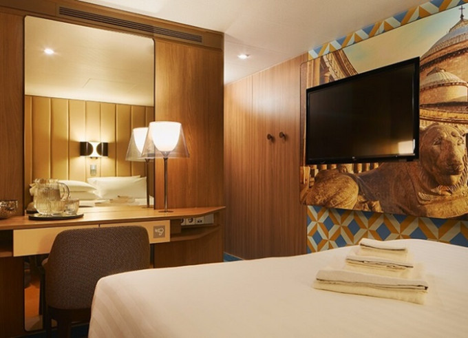 - Ubytovanie v kajute vybranej kategórie. Základné vybavenie: kúpeľňa s WC a sprchovacím kútom, 2 lôžka spojiteľné do manželskej postele, skrine, nočné stolíky, toaletný stolík a stolička, nastaviteľná klimatizácia, interaktívna satelitná TV s plochou obrazovkou, trezor, sušič na vlasy, uteráky a posteľné prádlo, Wi-Fi pripojenie (za poplatok), 24/7 kajutová služba (za poplatok).
