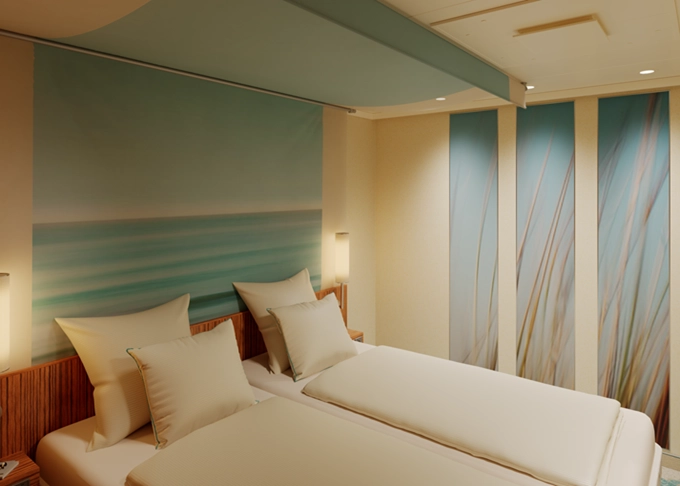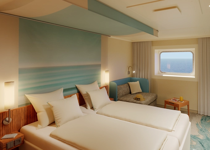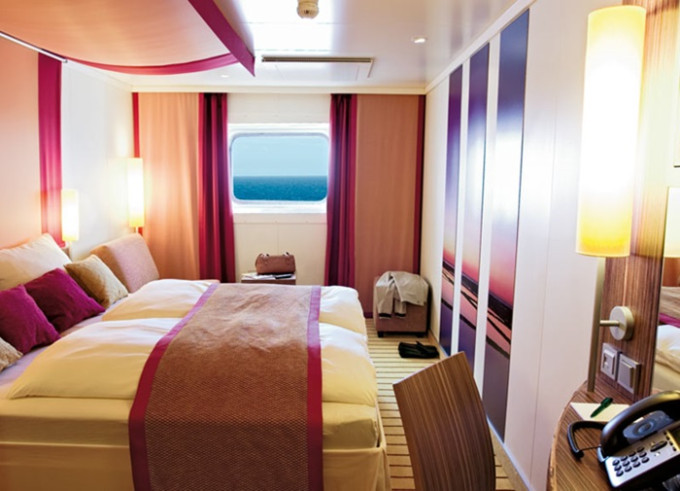CA - Vonkajšia kajuta PREMIUM / obmedzený výhľad 14-16,5 m². Neotvárateľné okno / obmedzený výhľad. 6. paluba. Max 2 osoby. Cenový model Premium. 4 290 € 2 145 € za osobu