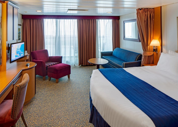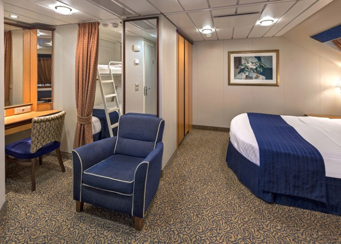 1K - Veľká vonkajšia kajuta Ultra Spacious 24,5 m². Neotvárateľné okno. Oddelená časť s poschodovou posteľou. Max. 5-6 osôb. 3 444 € 861 € za osobu