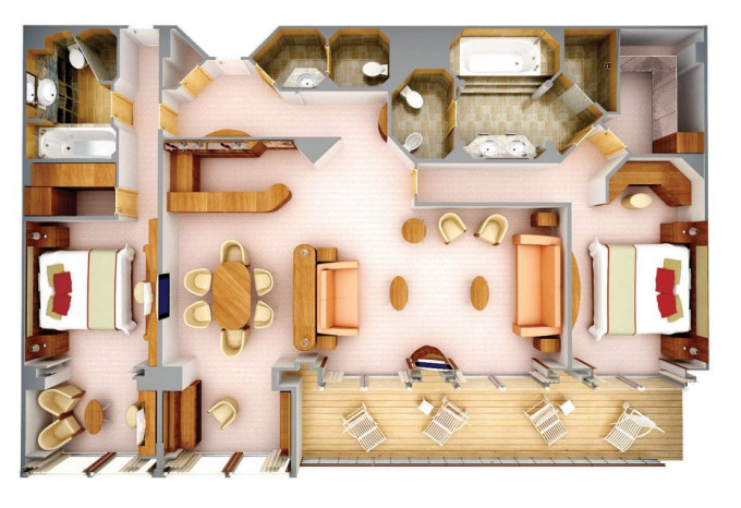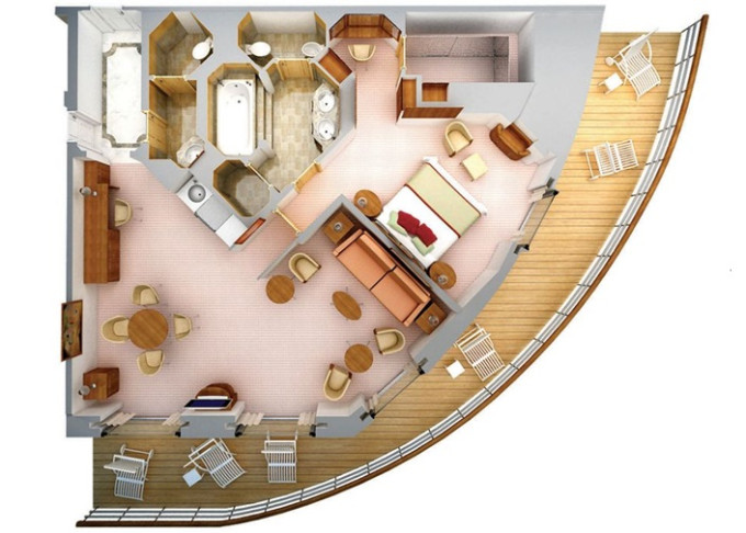 R2 - Royal Suite 2 127 m² (vrátane 18 m² balkónov). Royal Suite prepojená s Veranda Suite. 7. paluba vpredu. Max 5 osôb. | 59 600 € 29 800 € za osobu |