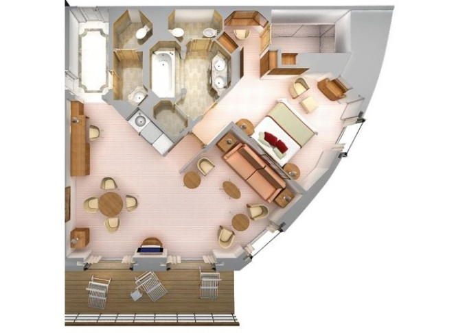 R1 - Royal Suite 1 92 m² (vrátane balkóna 12 m²), Spálňa s obývacou a jedálenskou časťou. 7. paluba vpredu. Max 3 osoby. | 41 400 € 20 700 € za osobu |