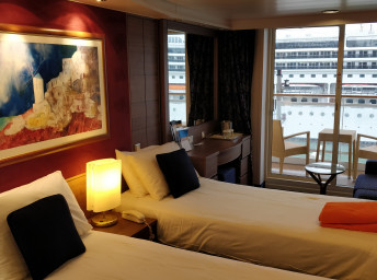 Suite s balkónom: cca 31m² kajuta s manželskou posteľou (na požiadanie 2 oddelené postele) a rozkladacia pohovka. Klimatizácia, kúpeľňa s vaňou, toaletný stolík, priestorná skriňa, interaktívna TV, telefón, minibar, sejf, sušič na vlasy. Balkón so stolíkom a stoličkami. Internetové pripojenie (za poplatok).