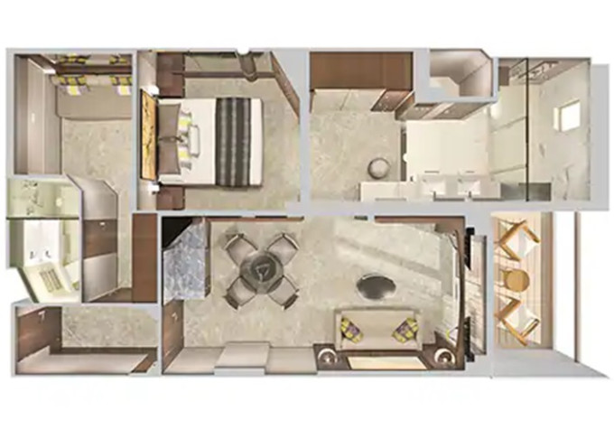 S4 - Deluxe Family Suite - 2 spálne 50 m² / balkón 5 m². 11. paluba - vpredu, stred. Max 6 osôb. Výhody Club. | 7 964 € 3 982 € za osobu | ||