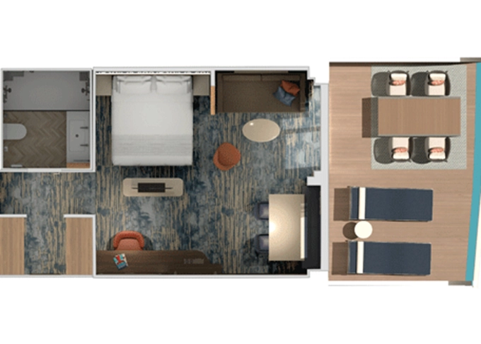 | HU - Suite Havana Cabana Corner 33 m² + vonkajšie rohové patio 15 m². 8. paluba vpredu. Max 3 osoby. Tropický štýl, vstup do exkluzívnej zóny Havana. Výhody Suite. | 5 332 € 2 666 € za osobu | ||