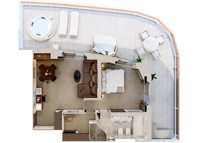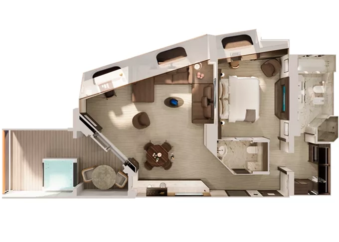 Ocean Residence - Cove Residence s vírivkou Suita + terasa s vírivkou a lehátkami 56 m². Spálňa s obývacou a jedálenskou časťou, šatník. Koktailová súprava, minibar, kávovar, vodná kanvica, ďalekohľad, sejf, kúpeľňa so sprchou. Závesy, svetlo, klimatizácia ovládané smart technológiou. Taška Technogym Case Kit. Fľaša šampanského na privítanie. Maximálna kapacita 3 osoby. | 19 950 € 6 650 € za osobu | ||