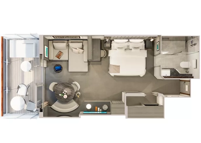 Ocean Residence - Cove Residence Suita + terasa so sedením a lehátkami 56 m². Spálňa s obývacou a jedálenskou časťou, šatník. Koktailová súprava, minibar, kávovar, vodná kanvica, ďalekohľad, sejf, kúpeľňa so sprchou. Závesy, svetlo, klimatizácia ovládané smart technológiou. Taška Technogym Case Kit. Fľaša šampanského na privítanie. Maximálna kapacita 3 osoby. | 32 492 € 8 123 € za osobu | ||