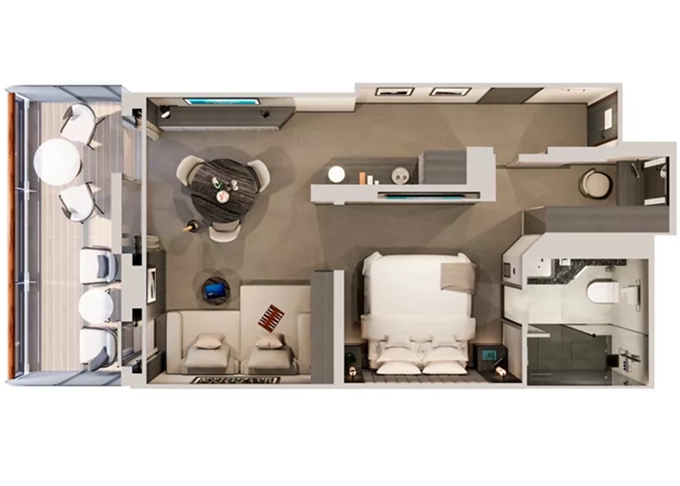 Ocean Residence - Cove Residence Suita + terasa so sedením a lehátkami 56 m². Spálňa s obývacou a jedálenskou časťou, šatník. Koktailová súprava, minibar, kávovar, vodná kanvica, ďalekohľad, sejf, kúpeľňa so sprchou. Závesy, svetlo, klimatizácia ovládané smart technológiou. Taška Technogym Case Kit. Fľaša šampanského na privítanie. Maximálna kapacita 3 osoby. | 18 951 € 6 317 € za osobu | ||