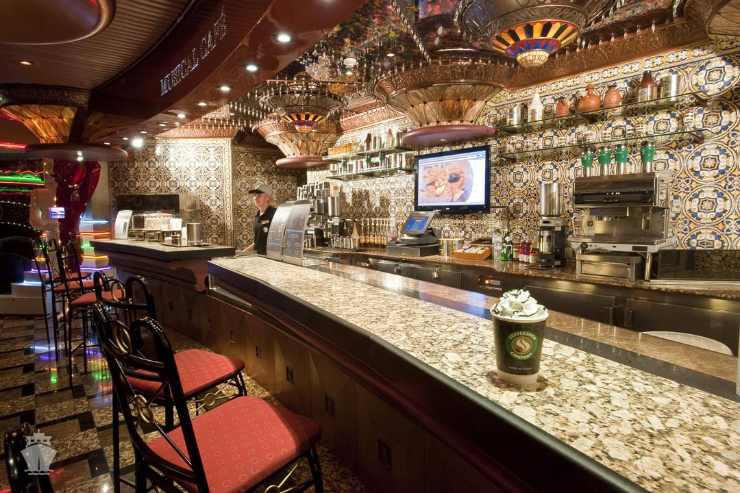 - Čapovaná voda, limonáda, ľadový čaj, káva, čaj, kakao z automatov v hlavnej reštaurácii Main Dining Room a bufetovej 24/7 reštaurácii Lido
